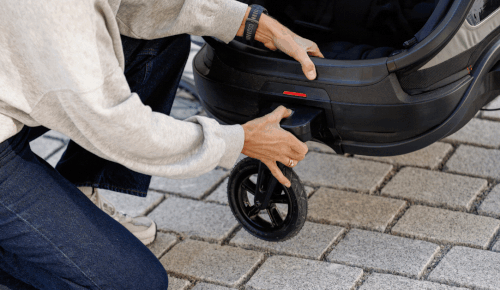 Das Buggyrad lässt sich leicht unter dem Wagen einklicken, wenn es nicht benutzt wird.