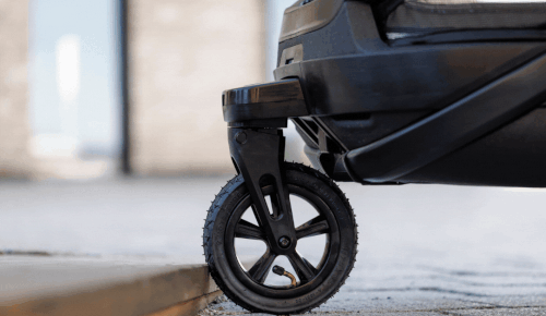 Luftfylt strollerhjul med fjæring og retningslås – skyves enkelt under vognen når det ikke er i bruk.